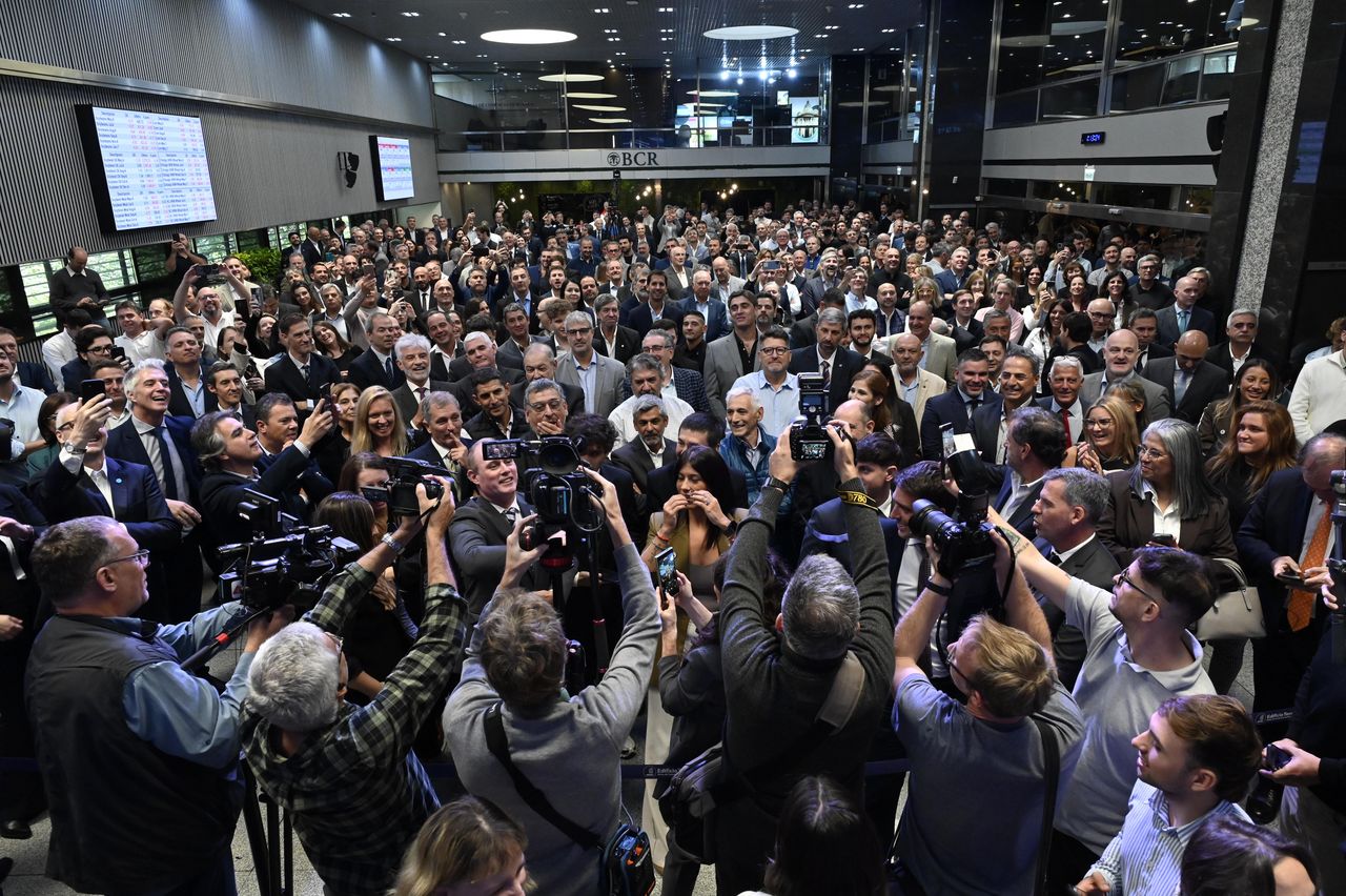 El evento fue encabezado por el presidente de la Bolsa de Comercio de Rosario, Pablo Bortolato, quien estuvo acompañado en el estrado por el gobernador de Santa Fe, Maximiliano Pullaro; el secretario de Gobierno de la Municipalidad de Rosario, Sebastián Chale; el director Nacional de Agricultura, Jorge Gambale; y la presidenta del Concejo de Rosario María Eugenia Schmuck.