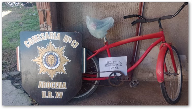 Una señora denuncio la faltante de la bicicleta de su sobrina de 14 años de edad, quien había dejado la misma en la escuela Alfonsina Storni 320 donde asiste, afuera estacionada sobre la pared, y cuando sale pasada las 12:00horas ya no estaba más, aportando que seria marca MONUMENTO, COLOR ROJA, TIPO PLAYERA, (como descripción el asiento tenía una bolsita de nailon color verde, sin frenos). Atento a lo sucedido personal de Comisaria 13ra se aboco a la busqueda pudiendo constatar qué un mahechor con buzo de color amarillo se la habia llevado, tras el intenso patrullaje a los fines de localizar al hombre mayor de edad, es que pueden aprehenderlo mientras transitaba por Ruta 11 Km 410, con sentido Sur-norte. Se prosiguen diligencias.