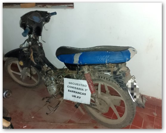 En la víspera en horas de la tardecita personal de Comisaria 3ra, prosiguiendo con las tareas realizadas a raíz de la sustracción de una motocicleta, es que se dirigieron a la zona de Puerto Aragón, continuando un amplio rastrillaje por por calle pública sin nombre, paralela a la calle principal Dr. Guena, donde se ubica la denominada Arenera Vieja, ingresando al mismo predio observaron que dentro de un pozo, que se asemeja a una cámara de hormigón, una motocicleta de similares características a la sustraída en horas de la mañana. Acto seguido se procede a cotejar los guarismos del Motovehiculo coincidiendo la numeración y dominio del mismo.