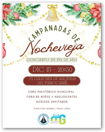 El próximo domingo 15, del corriente se realizara el evento denominado «CAMPANADA DE NOCHE VIEJA», concierto de fin de año, organizado por el CORO POLIFONICO MUNICIPAL DE GALVEZ, que se realizara en los ex galpones de maquinas del ferrocarril, a partir de las 20:30 h s.-