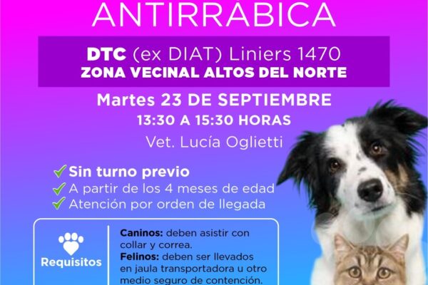 La Municipalidad de Gálvez informa que se realizará una jornada gratuita de vacunación antirrábica en el DTC (ex DIAT), Liniers…
