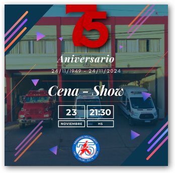 La Asociacion Bomberos Voluntarios de Galvez, celebra sus 75 ° Aniversario, y lo festejara con una cena a realizarse el próximo 23 de noviembre en las instalaciones de cuartel de Bomberos ubicado en Mitre 231 a partir de las 21:30 hs..-