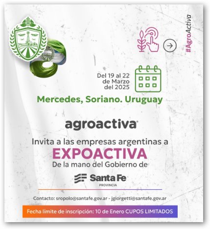 La Secretaría de Comercio Exterior del Ministerio de Desarrollo Productivo de Santa Fe y Agroactiva convocan a empresas de los Sectores Maquinaria Agrícola, Agropartes, Agtech e Implementos para el campo a participar del espacio de Santa Fe en Expoactiva 2025, que se desarrollará del 19 al 22 de marzo en Mercedes, Soriano, Uruguay.