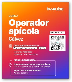 La Municipalidad de Gálvez, junto al Ministerio de Desarrollo Productivo de Santa Fe, invitan a participar de esta propuesta del programa Impulsa, pensada para fortalecer la producción apícola local.-El mismo dará inicio el dia Miércoles 26 de noviembre a las 19:30 hs.- Serán Horarios regulares: Sábados | 8:00 a 16:00 hs