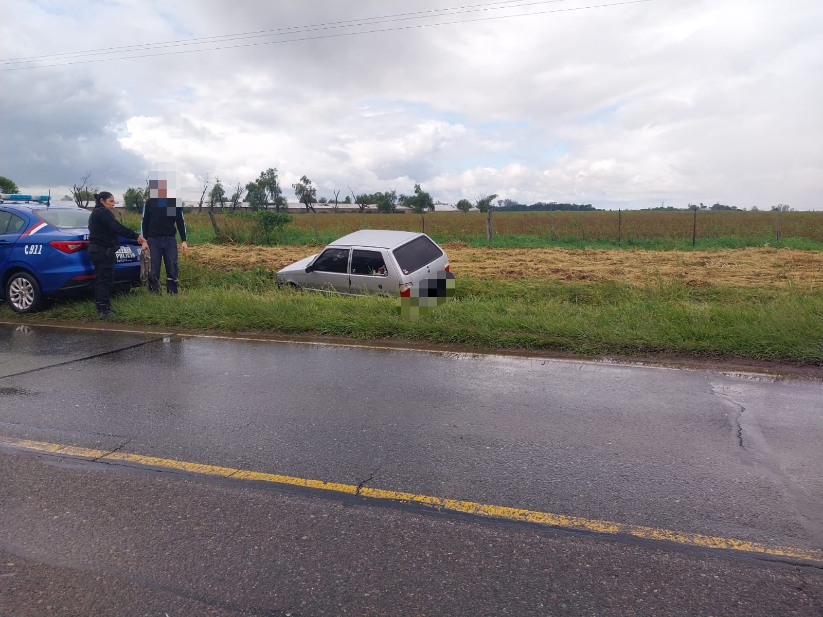 En la fecha siendo las 14.20 hs se recibio comunicación telefónica en virtud que había despistado un vehículo en la curva de Ruta Nacional N° 11, a metros del ingreso sur, aparentemente sin lesionados. El personal policial se acercó al lugar donde entrevista a un joven de 24 años, de esta localidad, quien conducía el automóvil marca Fiat Uno , color gris, manifestando el mismo que se encontraba circulando por la mencionada arteria de Sur a Norte para presentarse en su trabajo, por lo que pierde el control del vehículo debido al agua de la calzada despistando sin intervención de terceros. Raíz del siniestro no presentó heridas visibles, manifestando no estar lesionado.