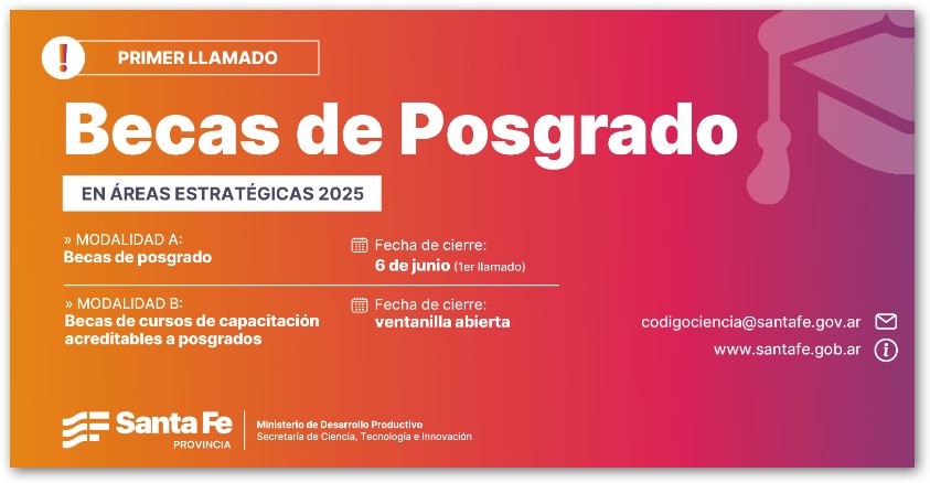 El Gobierno de Santa Fe, a través de la Secretaría de Ciencia, Tecnología e Innovación del Ministerio de Desarrollo Productivo, lanza la convocatoria “Becas de Posgrado en Áreas Estratégicas 2025”, con el objetivo de contribuir en la formación científico-tecnológica de personas con residencia en la provincia, sobre temas estratégicos santafesinos que fortalezcan el desarrollo productivo, económico y social.