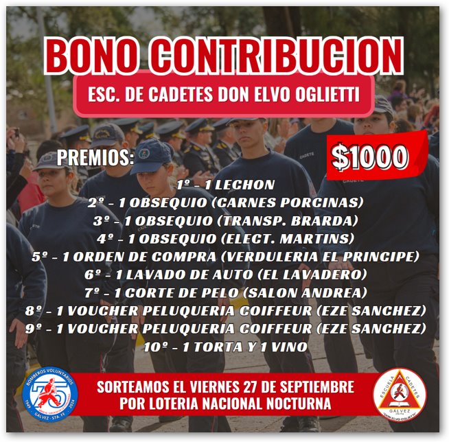 La escuela de Cadetes de la A.B.V.DE GALVEZ, «ELVO OGLIETTI», tiene a la venta un bono contribución, para seguir brindando educación y formación de calidad a futuros bomberos, de nuestra ciudad .