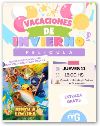Comenzaron las vacaciones de invierno y desde el Municipio y en conjunto con la Dirección de Cultura y Educación acercan esta propuesta para los pequeños para que puedan disfrutar sus vacaciones en familia en este caso para el dia jueves 22 de julio la propuesta es, en la CASA DE LA HISTORIA Y CULTURA DEL BICENTENARIO DE GALVEZ, se proyectara la película «UNA JUNGLA DE LOCURA».-