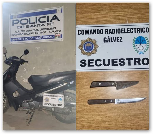 El conductor, un hombre de 29 años oriundo de Santa Fe, fue aprehendido y se procedió al secuestro del motovehículo. Además, durante el control se encontraron dos cuchillos con mango de madera en su poder.