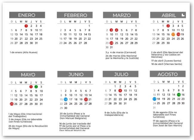- Abril: 2 de abril (Día del Veterano y de los Caídos en la Guerra de Malvinas), 18 de abril (Viernes Santo).