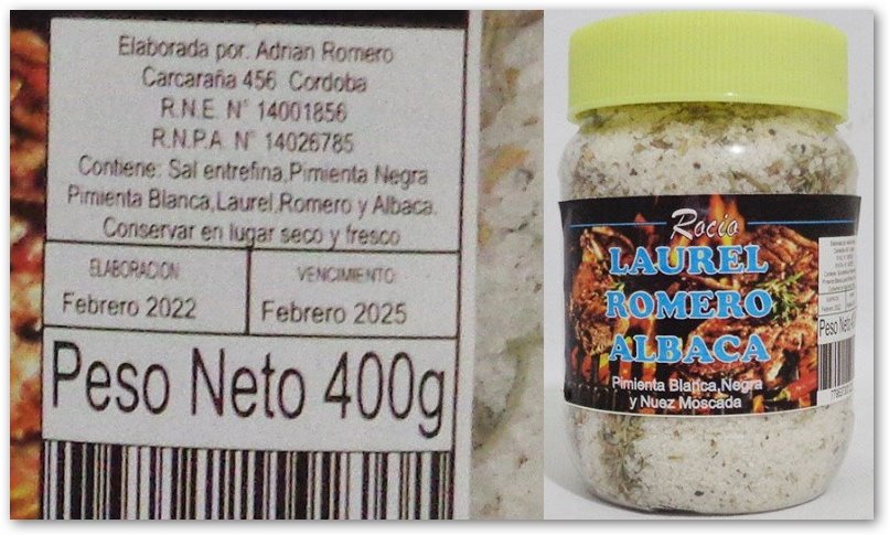 El producto incluía laurel, romero, albahaca, pimienta blanca y negra, y nuez moscada, fue elaborado en febrero de 2022 y tenía vencimiento para el mismo mes de 2025. En su etiquetado figuraba como producido en la ciudad de Córdoba, sin embargo, la Dirección General de Control de la Industria Alimenticia de la provincia advirtió que no se registran establecimientos habilitados en esa dirección.