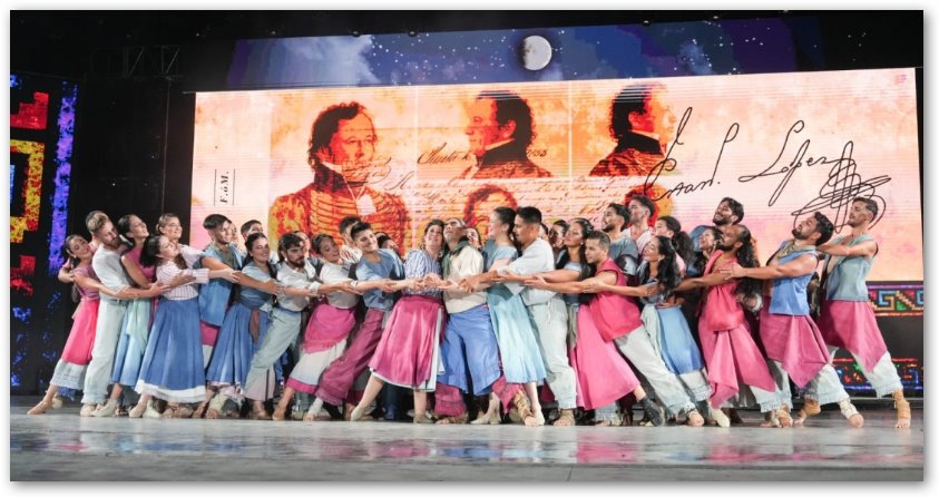 Conformada por 42 bailarinas y bailarines y un grupo musical de diez artistas, la Delegación Oficial de Santa Fe expresó en escena la diversidad cultural de la provincia, a través de distintos ritmos y danzas, con un destacado acompañamiento visual que reforzó el relato artístico del homenaje.