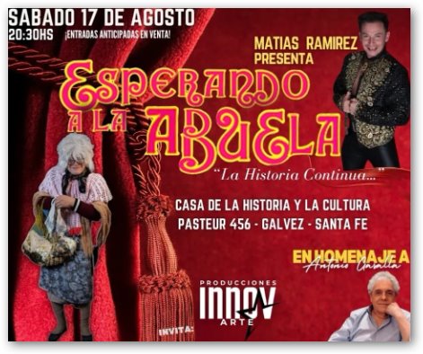 El próximo 17 de Agosto, llega a Gálvez “Esperando a la Abuela” de Matías Ramírez quien rinde un homenaje a Antonio Gasalla, una obra de teatro, para no parar de reír!! Un unipersonal para disfrutar con familia y amigos!
