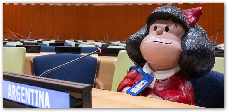 Mafalda, el icónico personaje creado por el dibujante argentino Quino, cumplió el sueño que alguna vez expresó en sus viñetas: visitar la sede de las Naciones Unidas en Nueva York. En una jornada especial, una estatuilla de Mafalda, esculpida por el artista Pablo Irrang, recorrió varios de los lugares más emblemáticos de la ONU, incluyendo el cuarto de los intérpretes en español, informó Noticias ONU.