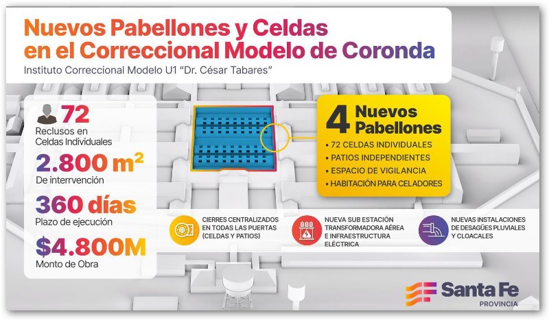 El proyecto elaborado desde la Dirección Provincial de Arquitectura e Ingeniería (Dipai) corresponde a la construcción de 4 nuevos pabellones de aislamiento y 72 celdas en la Unidad Penitenciaria N°1, de la ciudad de Coronda.