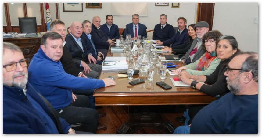 El encuentro fue encabezado por el ministro de Gobierno e Innovación Pública, Fabián Bastia; acompañado de sus pares de Economía, Pablo Olivares, y de Trabajo y Seguridad Social, Roald Báscolo; además de Marcelo Delfor, en representación de ATE, y Jorge Molina, por UPCN.