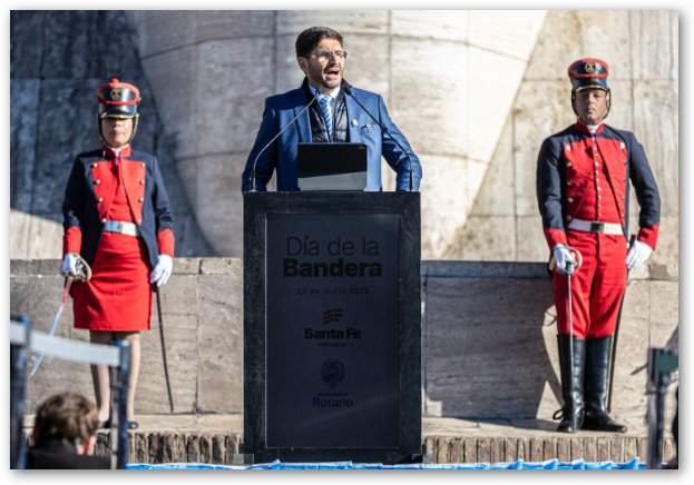 Luego del izamiento de la bandera nacional en el mástil mayor del Monumento, el gobernador Maximiliano Pullaro brindó su discurso central: “El pueblo y los gobiernos de la Nación, de la provincia y de la ciudad nos unimos bajo una misma bandera, que está por encima de nuestras diferencias ideológicas o partidarias. La bandera es unidad, es respeto por el otro. Es esa identidad colectiva que muchas veces nos quisieron arrebatar, pero que cada 20 de junio venimos aquí a defender”, afirmó.