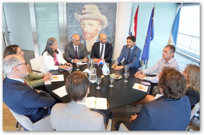 La agenda comenzó en la Embajada del Reino de los Países Bajos, con el embajador Mauritz Verheijden. Países Bajos es una potencia global en ingeniería portuaria y dragado, además de ser la quinta economía de la Unión Europea y el principal hub logístico del viejo continente a través del Puerto de Rotterdam. Durante el encuentro se analizaron inversiones neerlandesas en Santa Fe y el crecimiento de las exportaciones hacia ese destino. Puccini señaló: “El diálogo con el embajador Verheijden es fundamental. Países Bajos no solo es un destino clave para nuestra producción, también es un referente mundial en agroindustria tecnificada, gestión hídrica y transición energética, cuestiones centrales para nuestra provincia”.