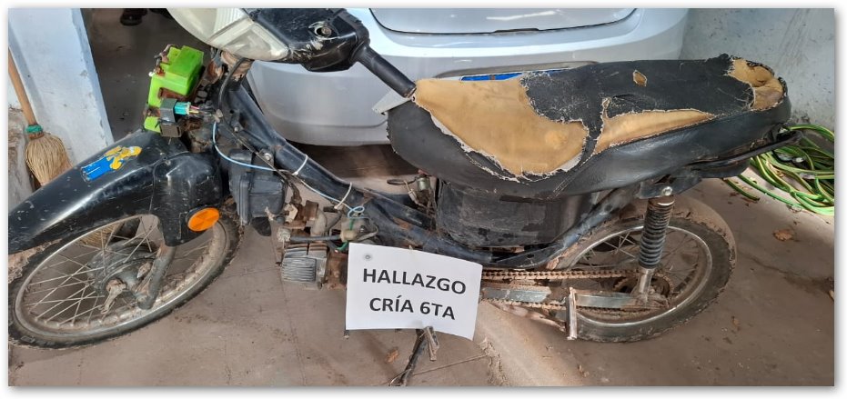 En la víspera alrededor de las 06:30 horas se recibe denuncia por parte de una Mujer, a quien le sustrajeron su motocicleta marca Keller 110 color negra, la cual dejó estacionada en la esquina de la terminal sobre Ruta 65 cerca de una pinturería, hecho que pudo concretarse durante la madrugada. Que tras dichos de unos menores se pudo hallar la misma en un camino rural cercano al Club Italiano de esta ciudad, sobre la cuneta Este de mediana profundidad, siendo las 17:30 horas se procede al secuestro del birrodado el cual se encontró en mal estado de conservación, sin carenados. Se hace entrega a su propietaria.-