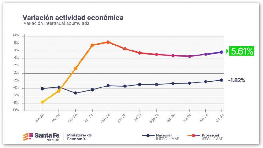 Dentro de las mediciones por segmentos, en agricultura y ganadería, el indicador que muestra el Estimador Mensual de Actividad Económica Nacional entre 2023 versus 2024, marca un 31 % de aumento, mientras que el Indicador Mensual de Actividad Económica en la provincia de Santa Fe fue del 73,8%. Si se compara diciembre 2023 contra diciembre 2024, los números nacionales registraron un crecimiento del 6,7 %, mientras que los provinciales 15,8 %.
