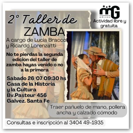 El próximo sábado 26 de Julio del corriente año, en las instalaciones de la CASA DE LA HISTORIA Y LA CULTURA DEL BICENTENARIO, de la ciudad de Galvez, se dictara el segundo taller, de ZAMBA.-